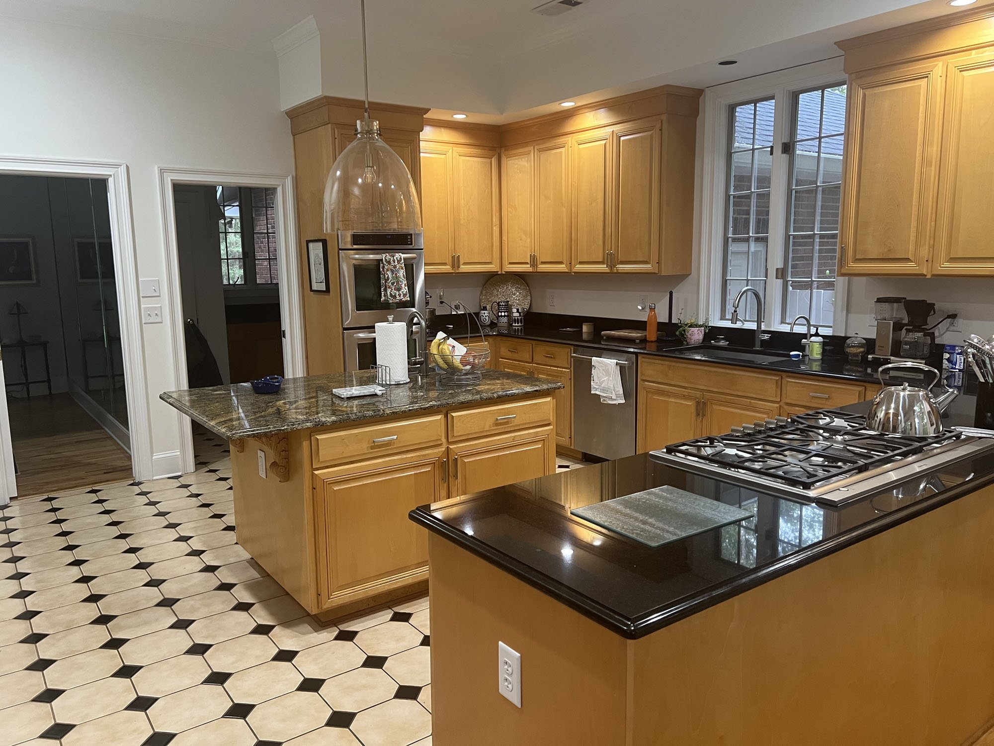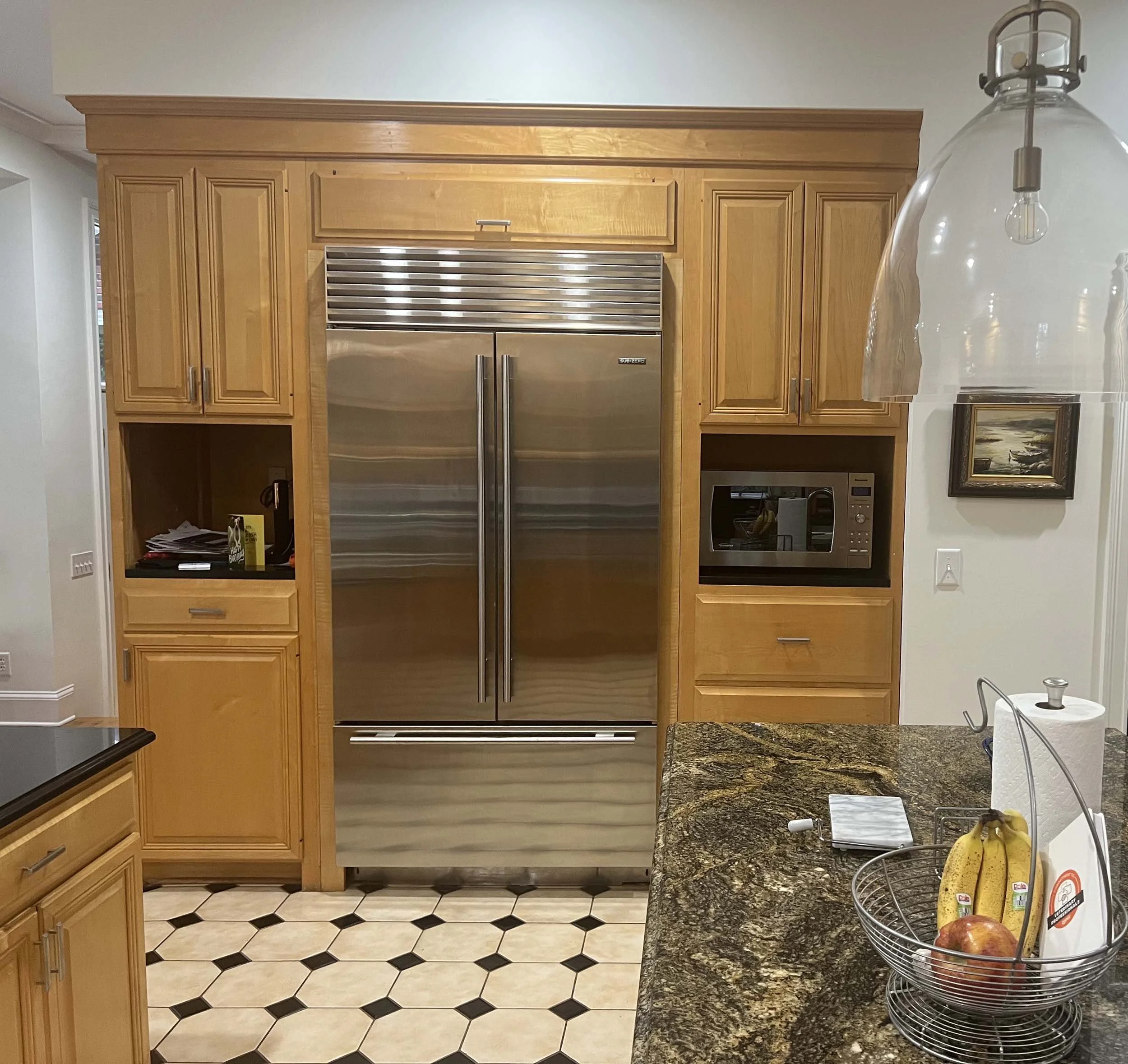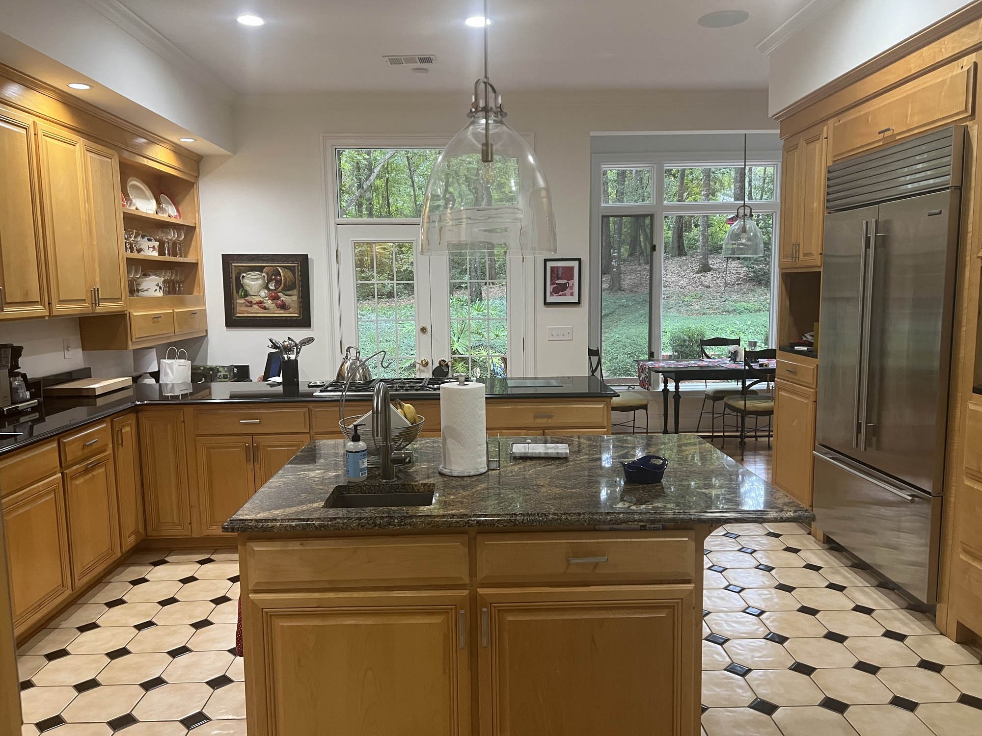 Although stylish in its day, the original thirty year old custom kitchen had no space to maneuver for my clients who loved to cook and spend time together in their kitchen. The space felt cramped and dark even though the room was large and open to a beautiful backyard.